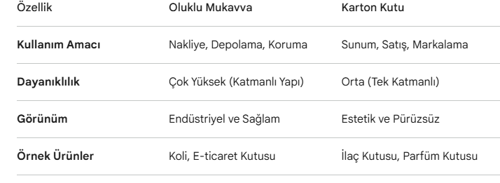 Ürünlerinizin güvenli bir şekilde taşınması ve şık bir sunumla müşteriye ulaşması için doğru ambalaj seçimi kritiktir. Genellikle birbirine karıştırılan ancak kullanım amaçları farklı olan Oluklu Mukavva ve Karton Kutu çözümlerimizle, her sektöre özel koruma sağlıyoruz.